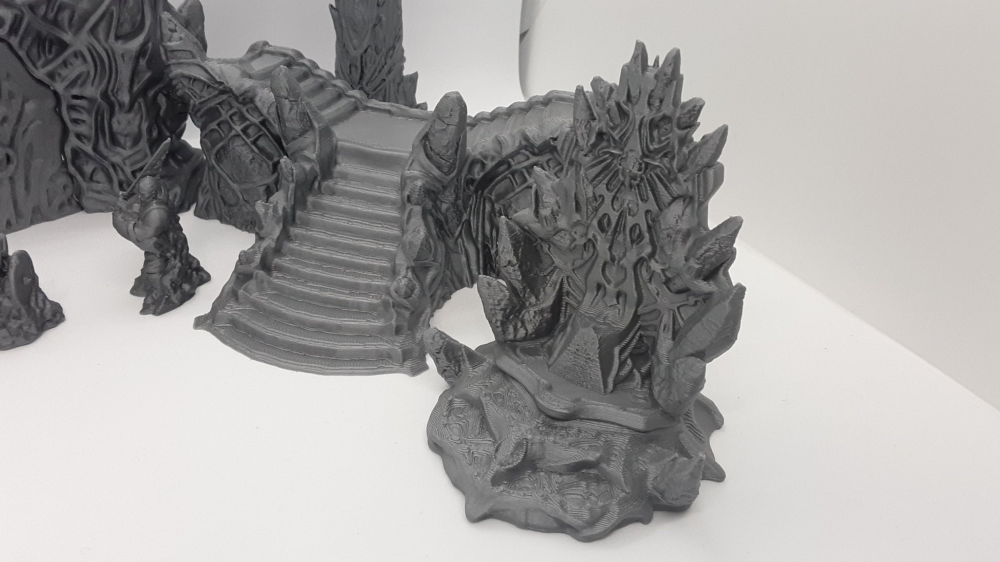 The large staircase measures approximately 2.25" tall, 5" wide, and 4" deep . The columns measure approximately 4.5" tall and are 1.25" in diameter. They are placed beside a D20 die (NOT included in sale) for size reference. This is sized to work with most 25mm/28mm/32mm scale or similar miniatures from many popular RPG dice games such as Dungeons and Dragons, Pathfinder, Warhammer, and many others.