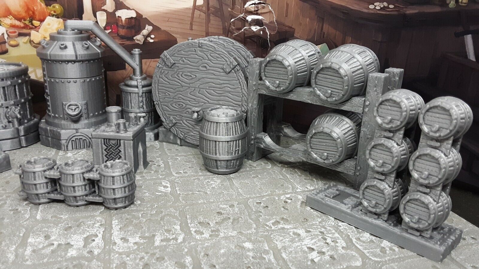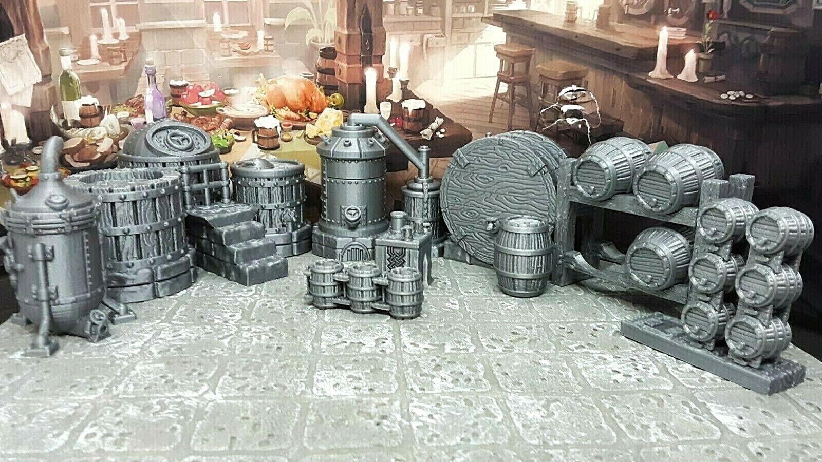 This unpainted 3D printed model comes in paintable, silver PLA plastic and includes a spirit still, boil kettle, brewing system, dwarven drinking table, 4 large barrels and shelf, 3 stacks of small casks and a shelf, and a fermentation cask. Many of these are also sold separately in our store. These were placed on a 1" x 1" grid surface in the photo for size reference. There is enough here to fill large dwarven brewery easily!