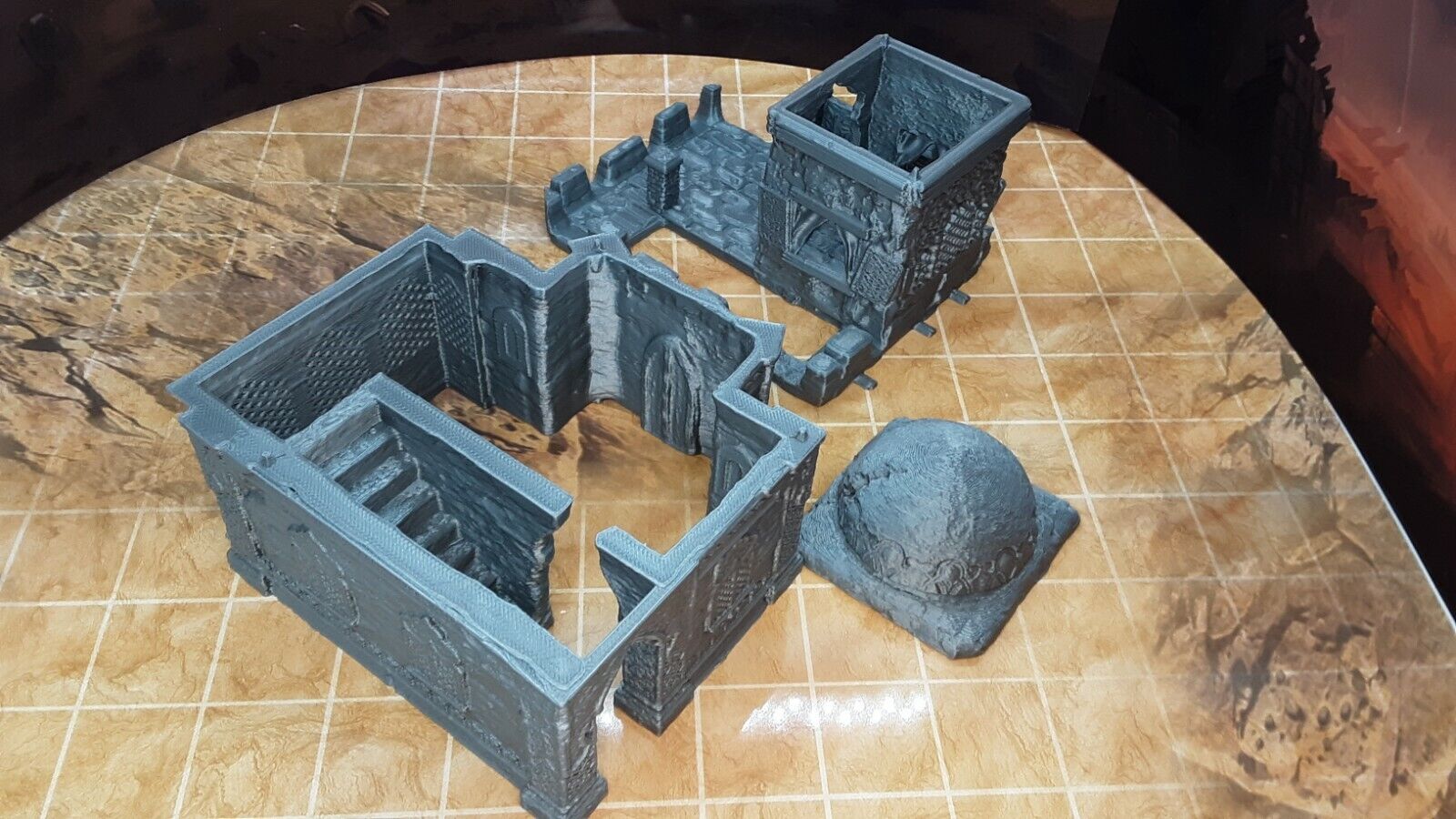 This unpainted 3D printed 4 piece set comes in easy to paint silver plastic. Assembled it measures approximately 5" tall x 3.75" wide x 4" deep. It is placed on a 1" x 1" grid surface in the photo and beside a D20 die (Not included in sale) for size reference. It is scaled to work with all 28mm/32mm scale or similar miniatures from many popular RPG dice games such as Dungeons and Dragons, Pathfinder, Warhammer, and many others.