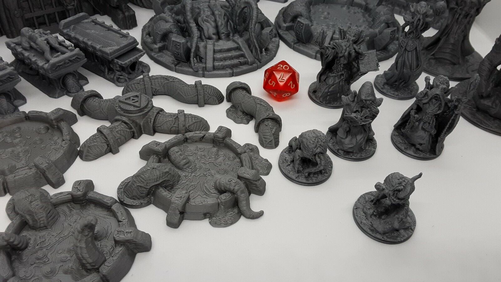 This unpainted 3D printed set comes in silver, easy to paint, PLA plastic and resin. They are placed beside a D20 die (NOT included in sale) for size reference. These are sized to work with most 28mm/32mm scale or similar miniatures from many popular RPG dice games such as Dungeons and Dragons, Pathfinder, Warhammer, and many others.