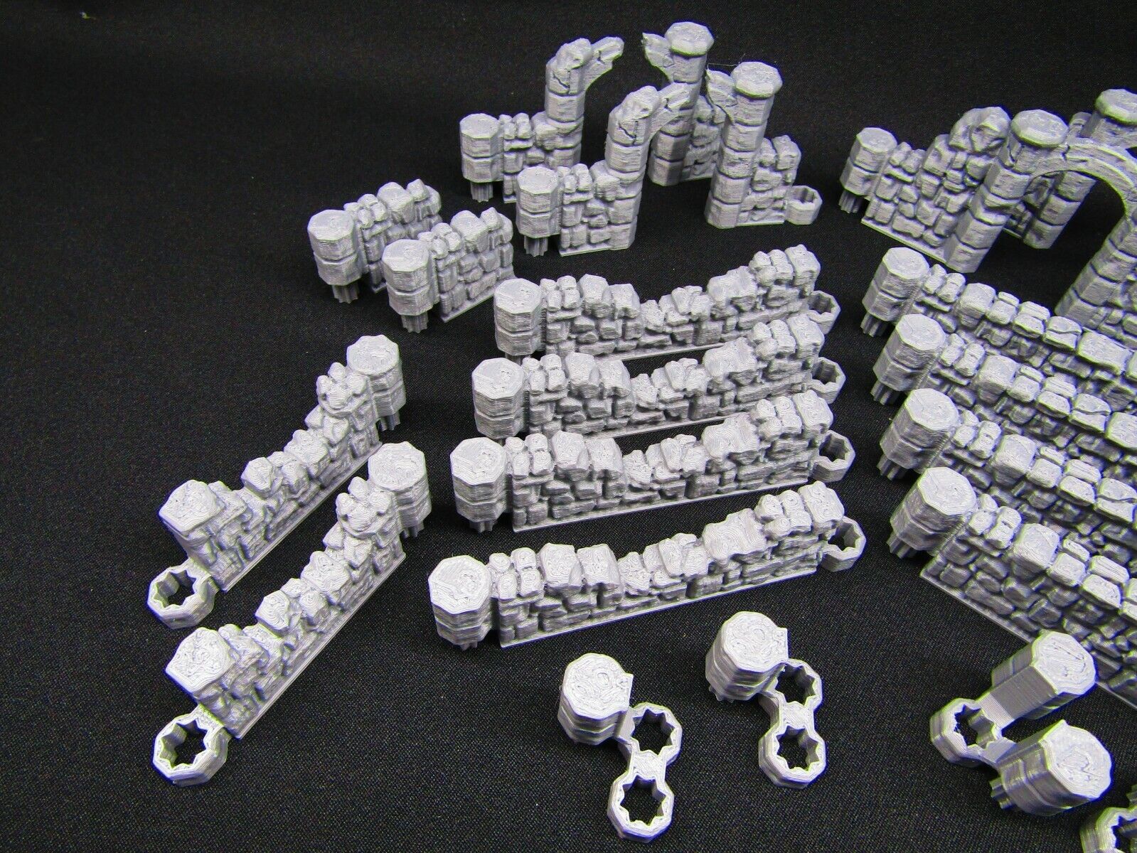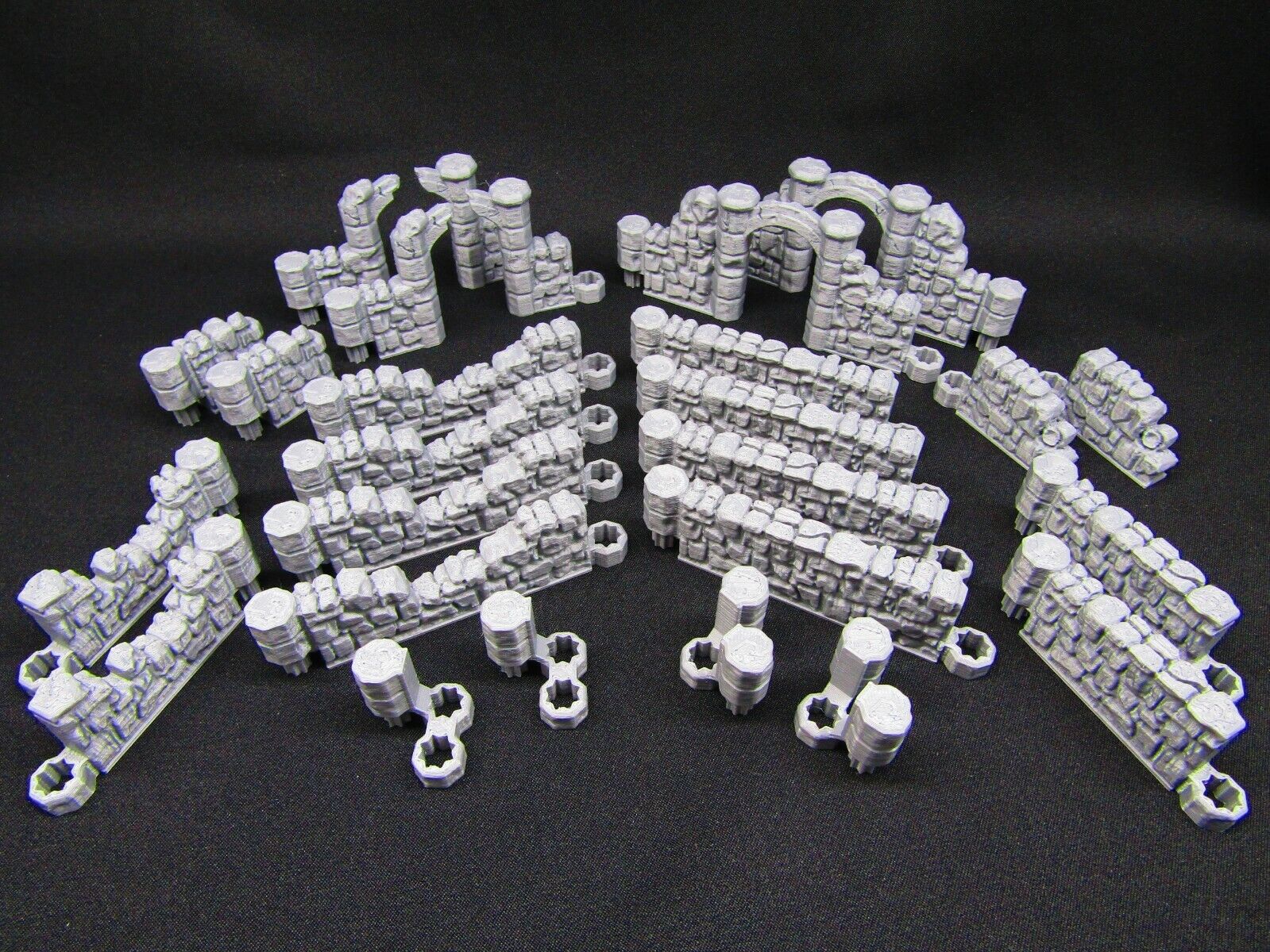 Number of Pieces: 26: 4x straight wall sections, 4x broken wall sections, 2x short wall sections, 2x broken short wall sections, 2x open doorways, 4x ruined doorway sections, 2x male wall ends, 2x female wall ends, 2x male-female-female splitters, 2x female-male-male splitters