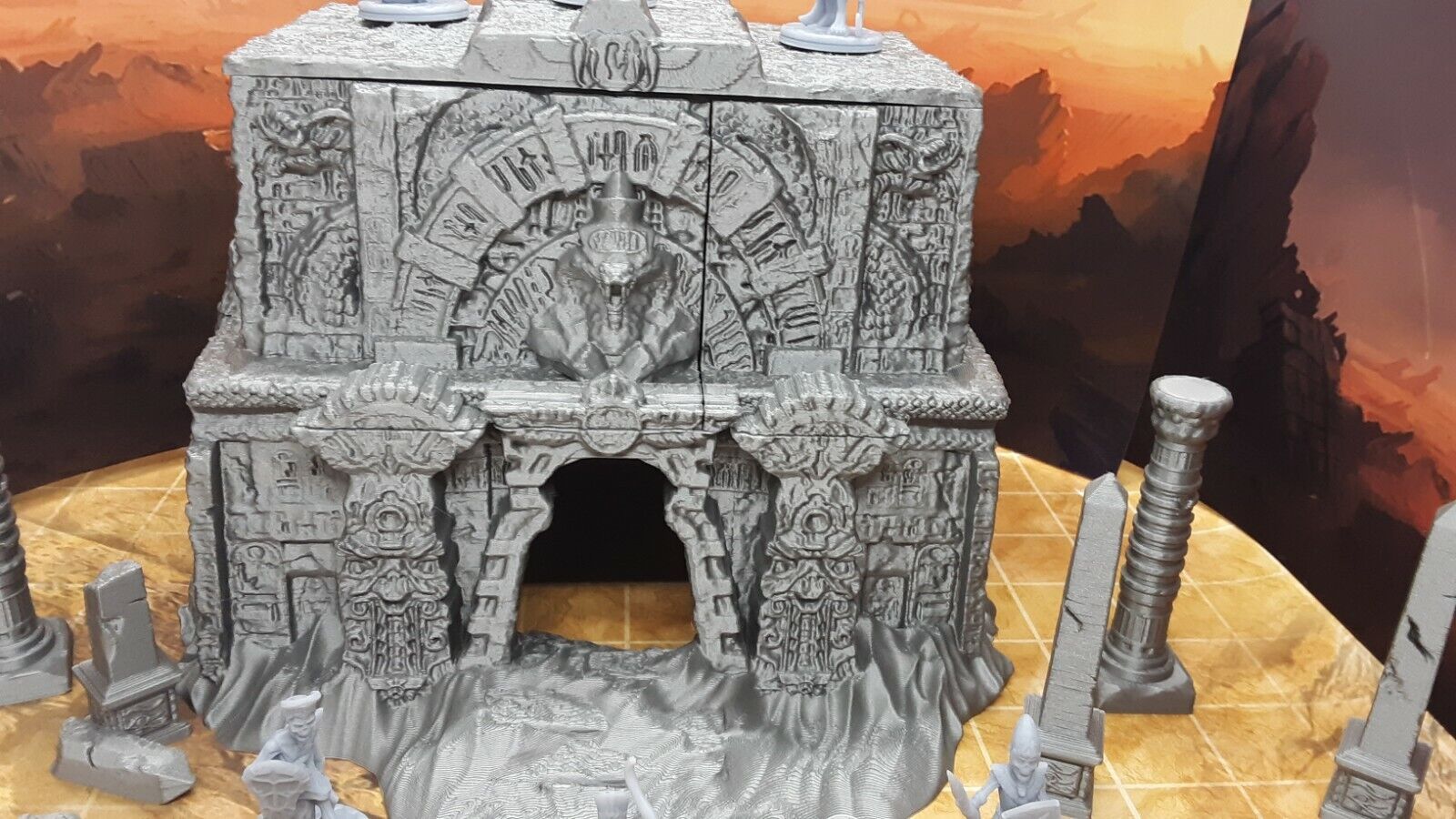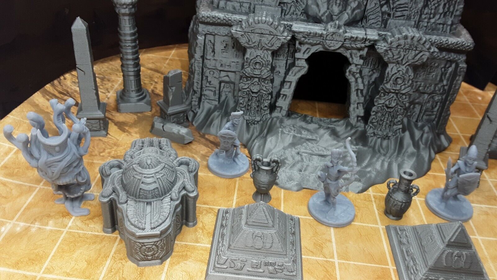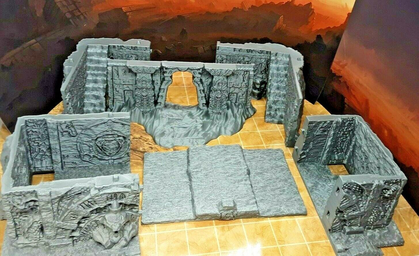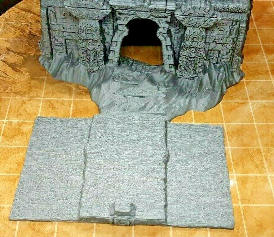 This set contains pieces in both easy to paint plastic and resin. The multifloor tomb measures a whopping 6" tall x 8" wide x 7.5" deep. The pieces are placed on a 1" x 1" grid surface in the photo for size reference. They are scaled to work with all 28mm/32mm scale or similar miniatures from many popular RPG dice games such as Dungeons and Dragons, Pathfinder, Warhammer, and many others.