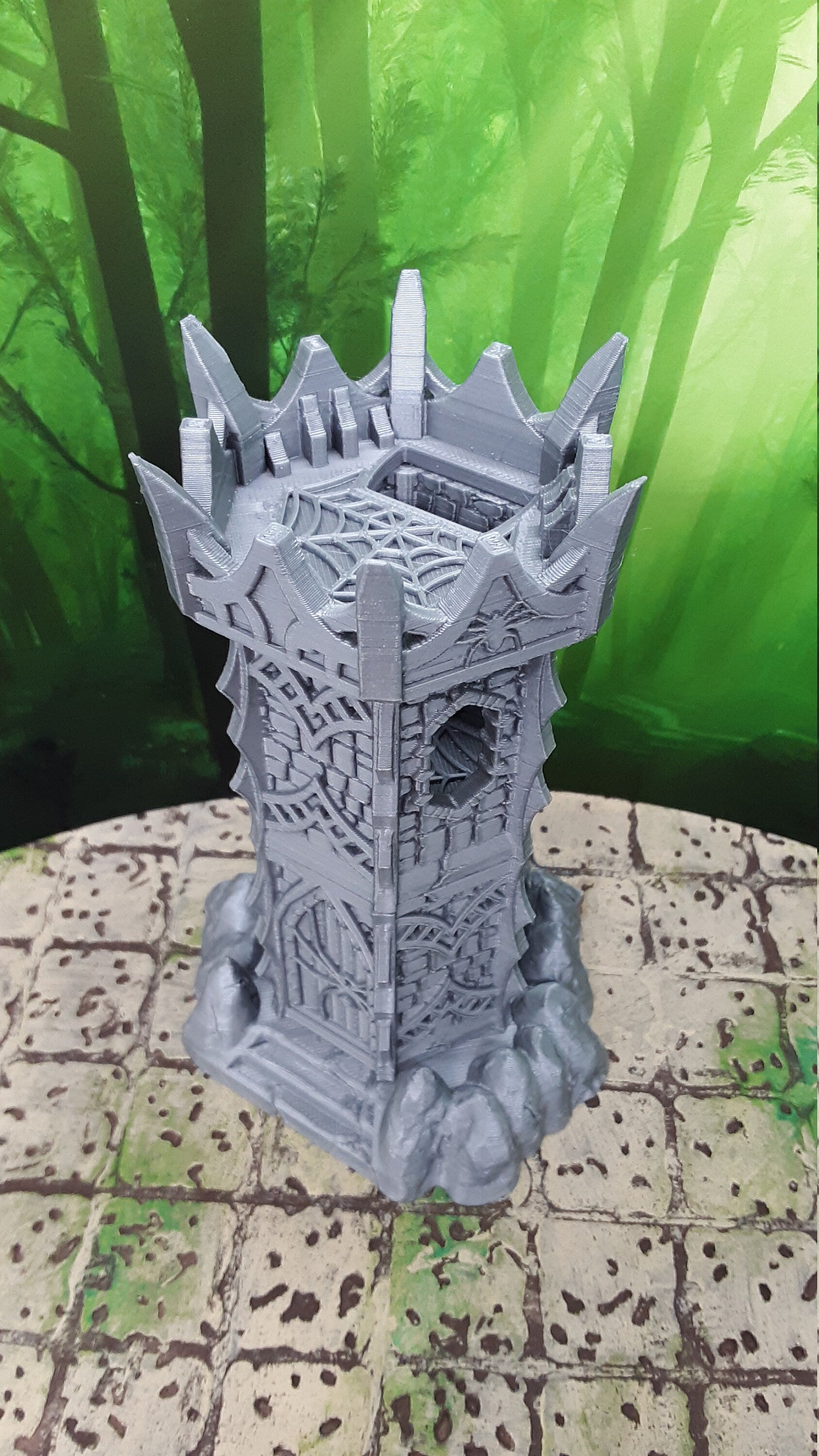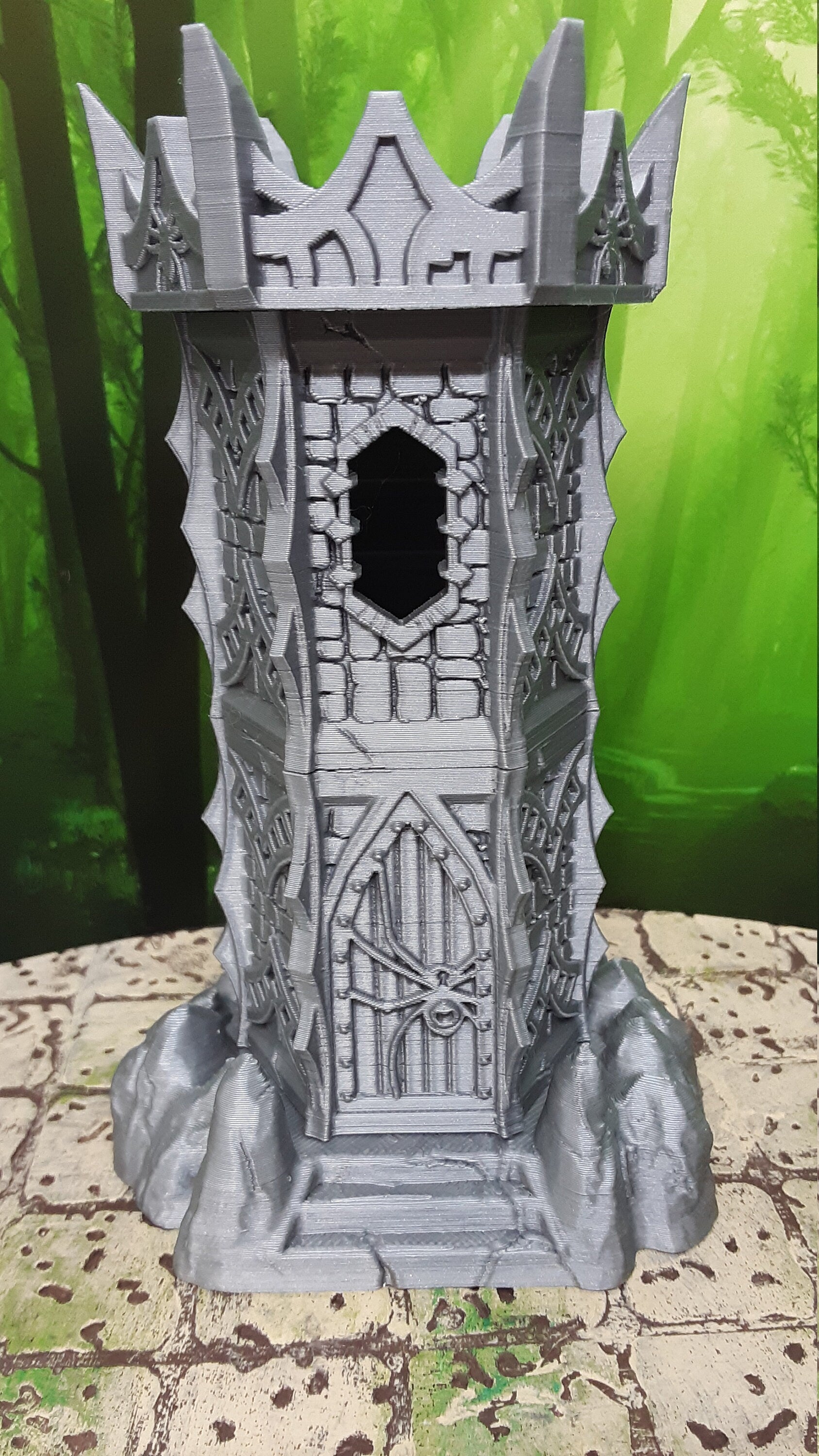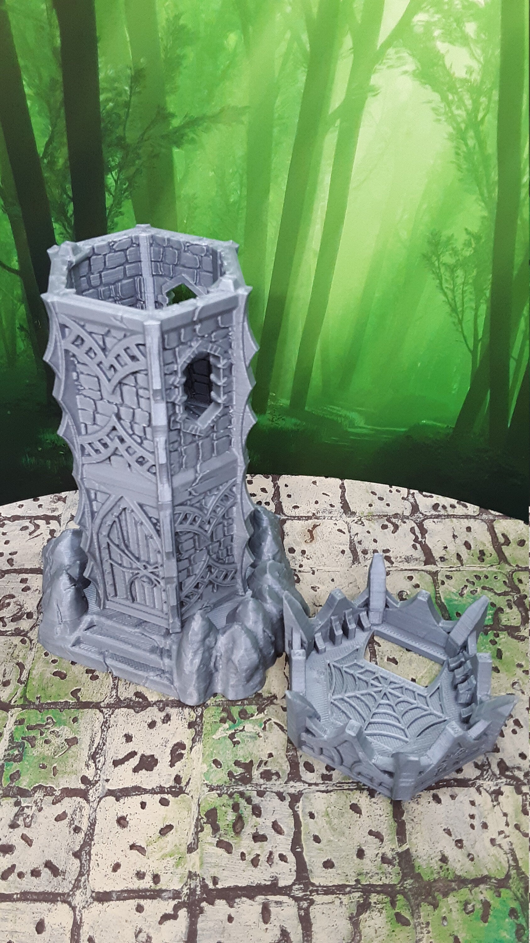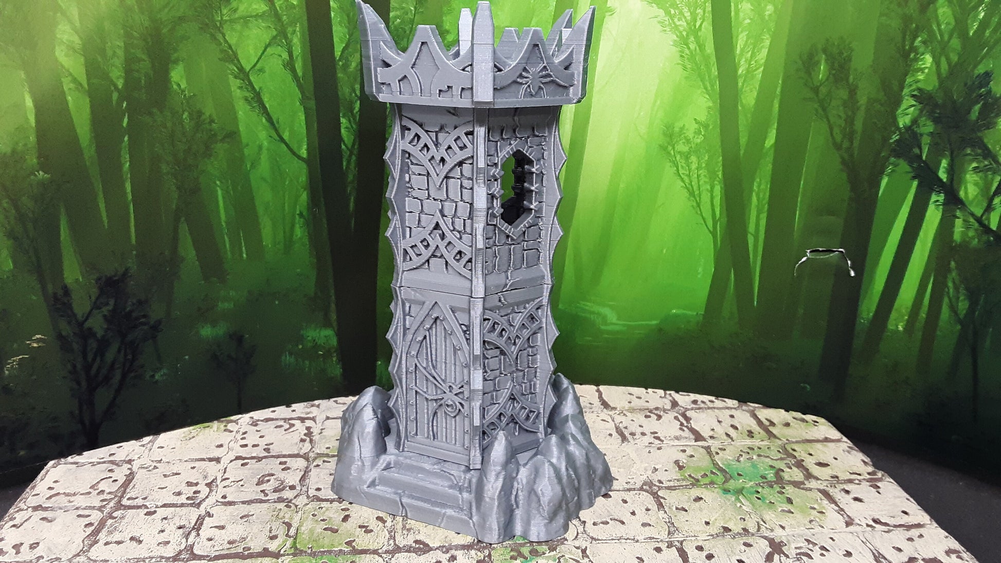 This piece, designed by EC3D, and part of the OpenForge line, is licensed to us to manufacture via 3D printer scaled at 28mm and is sized to work with all 28mm or similar miniatures from many popular RPG dice games such as Dungeons and Dragons, Pathfinder, Warhammer, and more. Tower includes 4 stackable modular pieces. When assembled tower stands 5.75" tall. Many other towers and models are available in our etsy store.