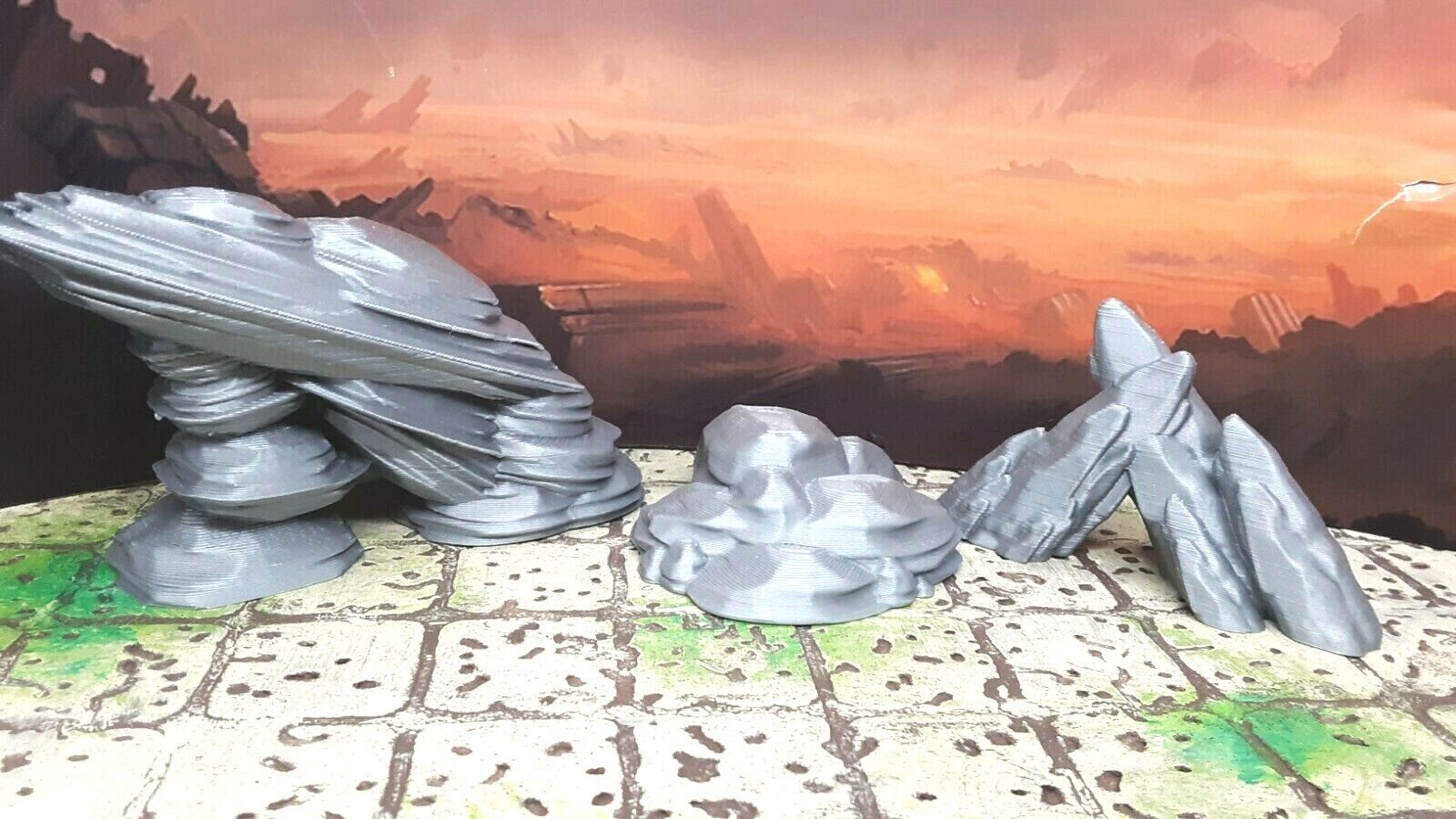 Designed by Ill Gotten Games, and licensed to us to manufacture via 3D printer this 3 piece set of rock formation scatter terrain will make your dull battlefield look better and giver your players and NPC's something to work with.
