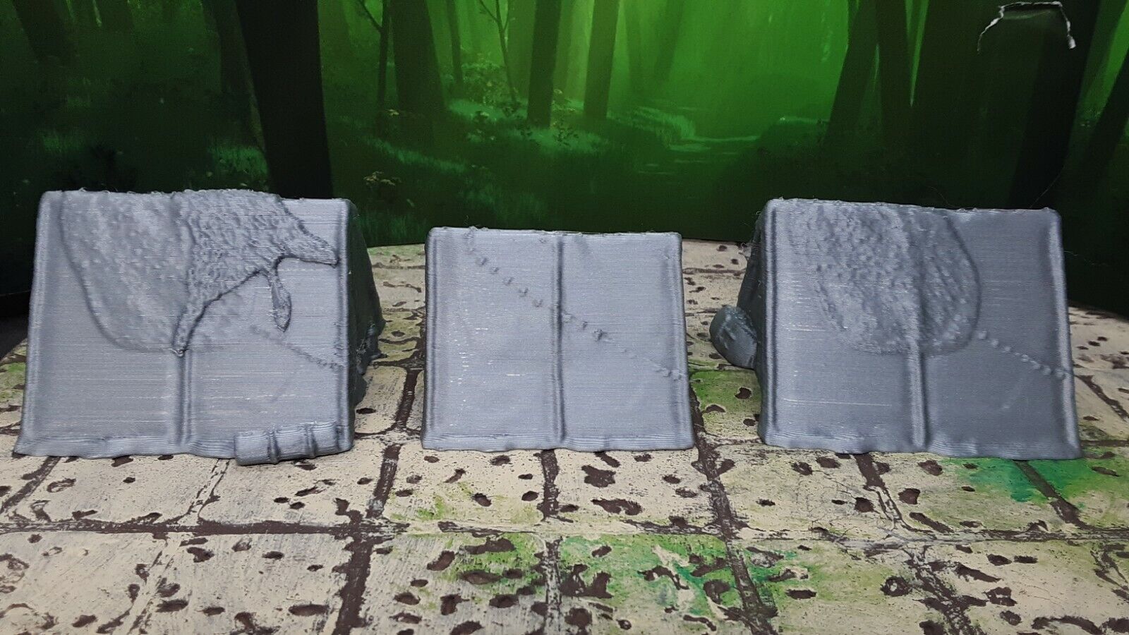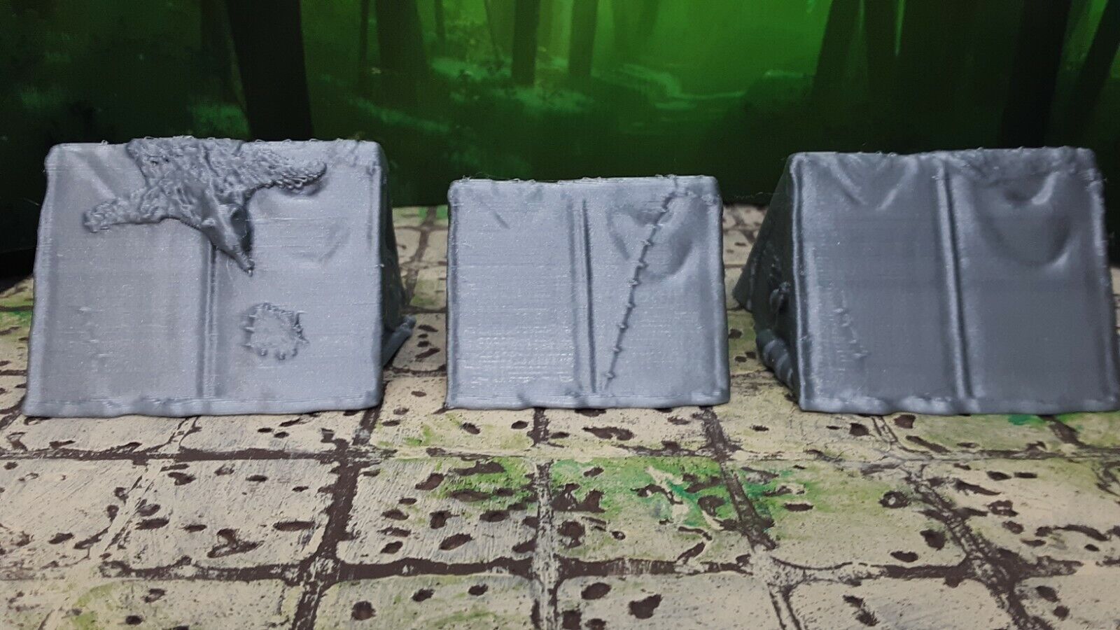 Designed by EC3D/Hero's Hoard and licensed to us to manufacture via 3D printer, this set of set 3 tents is scaled at 28mm. The 2 larger tents measure approximately "2 x "2 x "1.25 and the smaller one measures "1.5 x "1.5 x "1. They are sized to work with all 28mm or close miniatures from many popular RPG dice games such as Dungeons and Dragons, Pathfinder, Warhammer, and many others