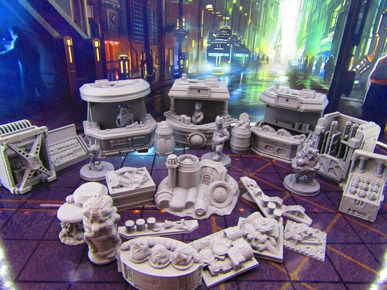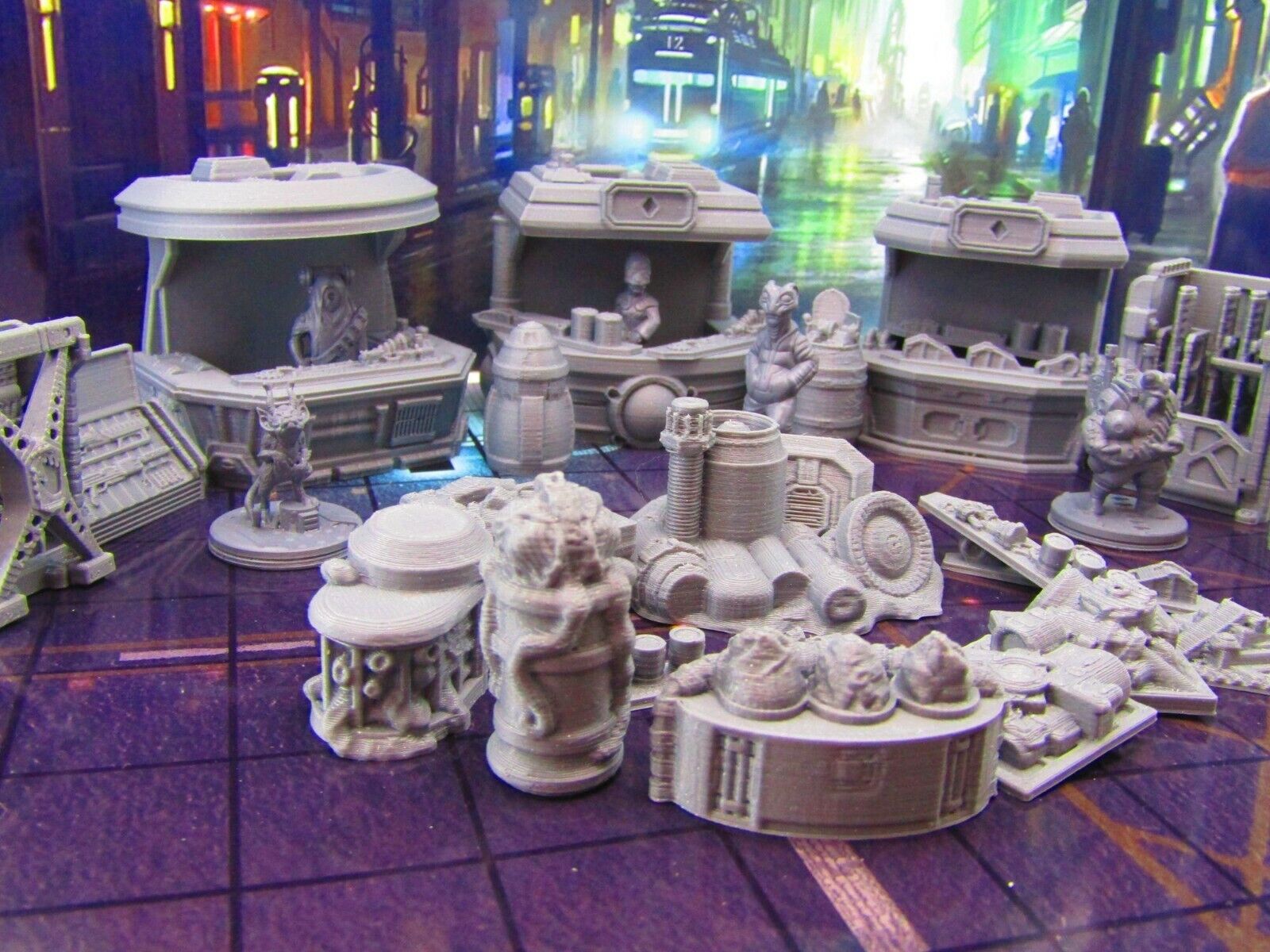 33pc Sci Fi Black Markets Stall Set w/ Merchants Miniatures Minis Set Sci Fi Rpg