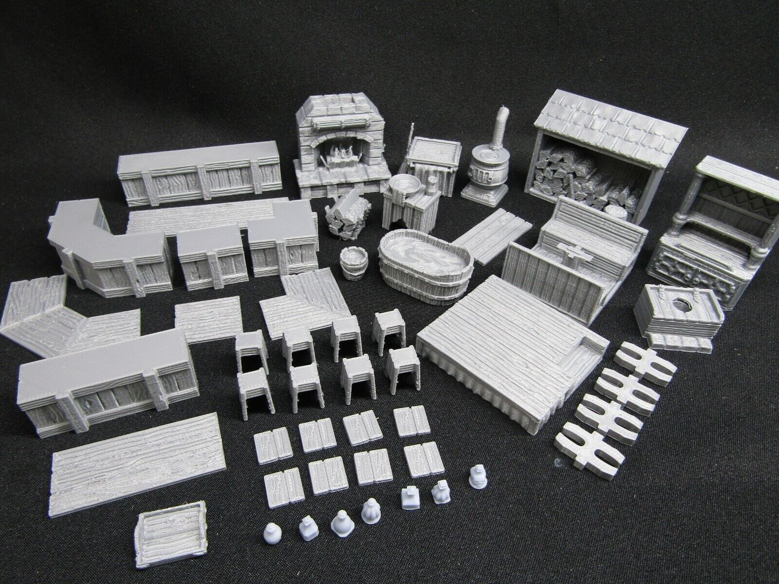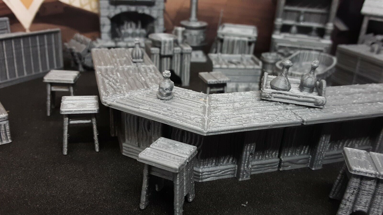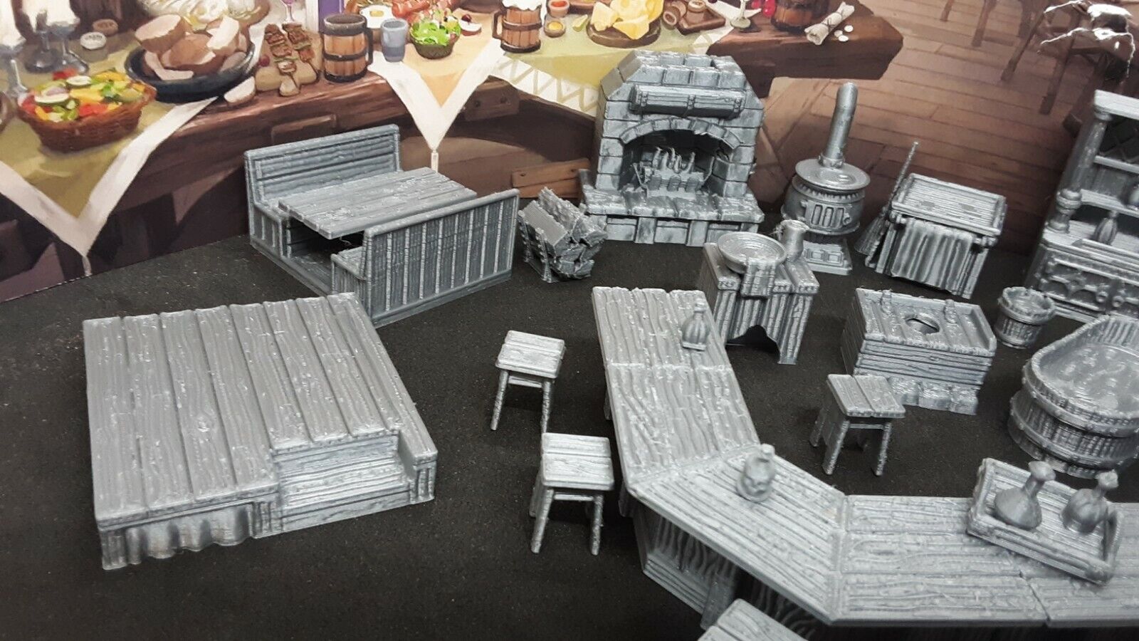 Designed by EC3D/Hero's Hoard, and licensed to us to manufacture via 3D printer, this is the perfect mini setup for decorating any inn or tavern. Scaled to 28mm, this set is sized to work with all 28mm/32mm or similar miniatures from many popular RPG dice games such as Dungeons and Dragons, Pathfinder, Warhammer, and many others.