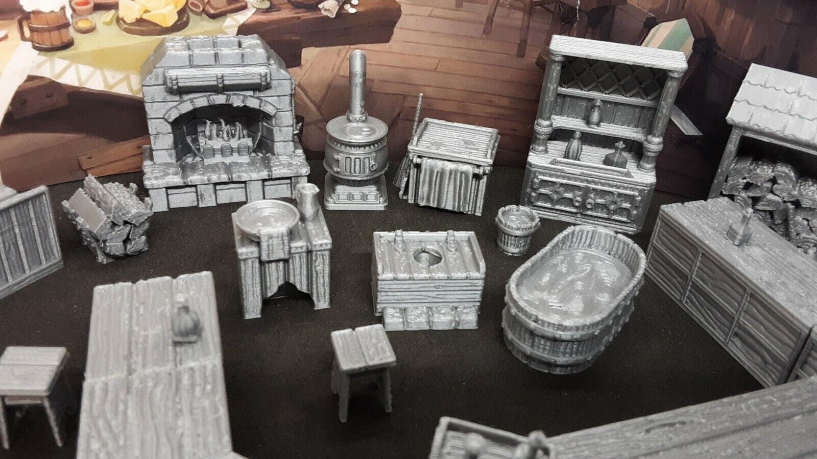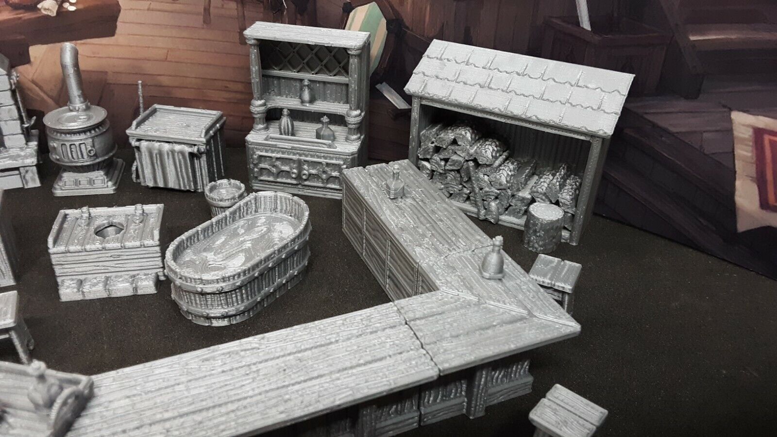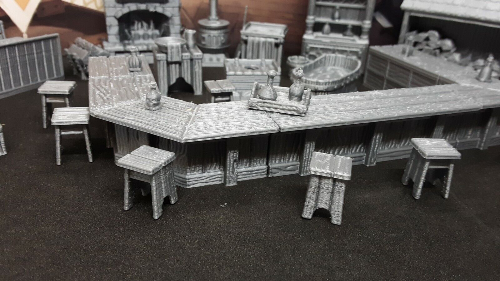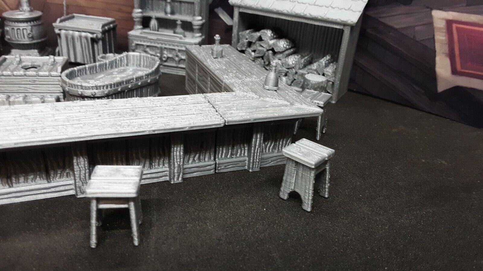 Designed by EC3D/Hero's Hoard, and licensed to us to manufacture via 3D printer, this is the perfect mini setup for decorating any inn or tavern. Scaled to 28mm, this set is sized to work with all 28mm/32mm or similar miniatures from many popular RPG dice games such as Dungeons and Dragons, Pathfinder, Warhammer, and many others.