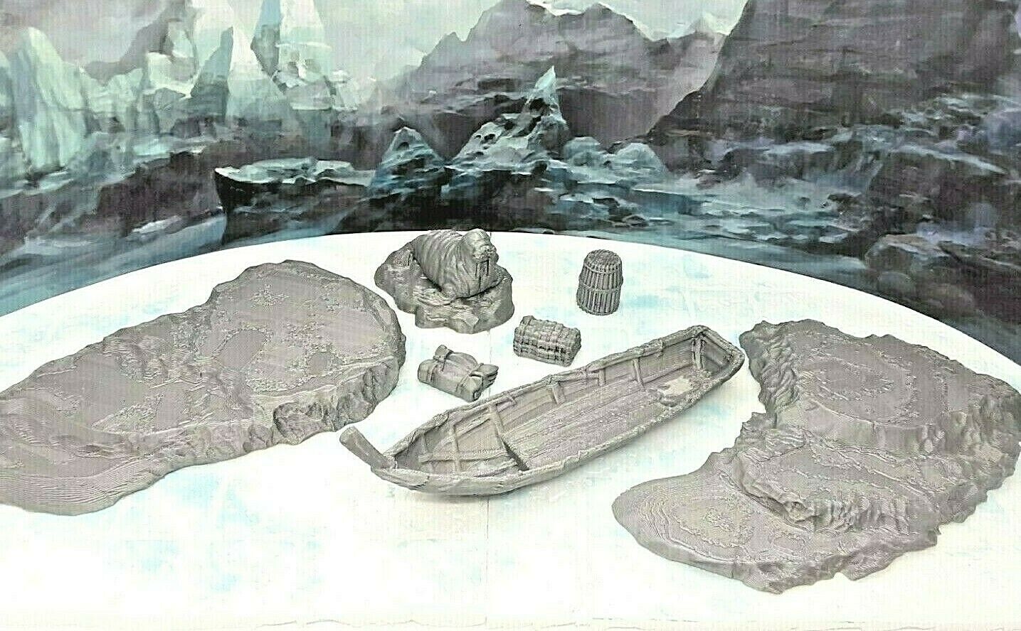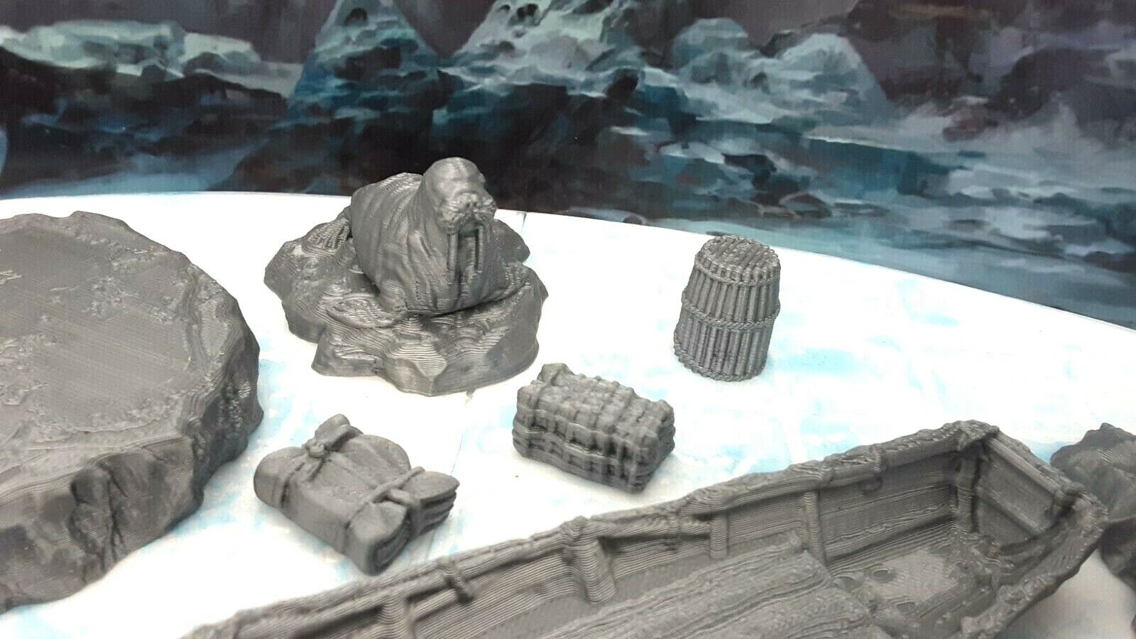 7 Piece Fisherman's Boat, Cargo, and Floating Ice Shelf Set Scatter Terrain D&D