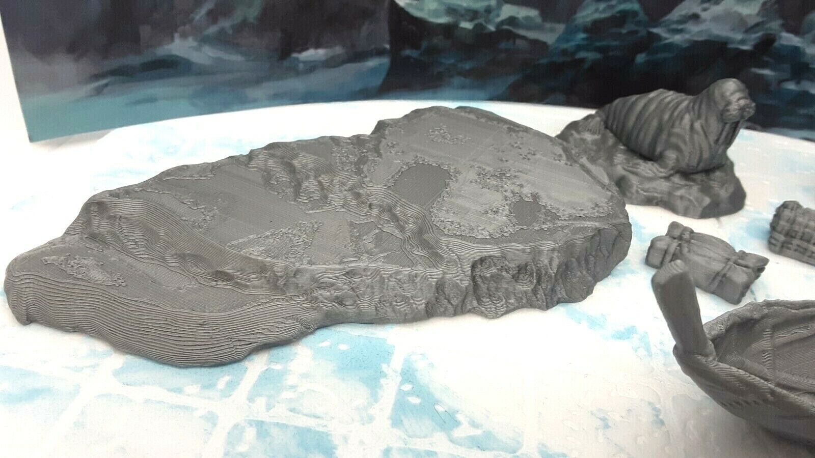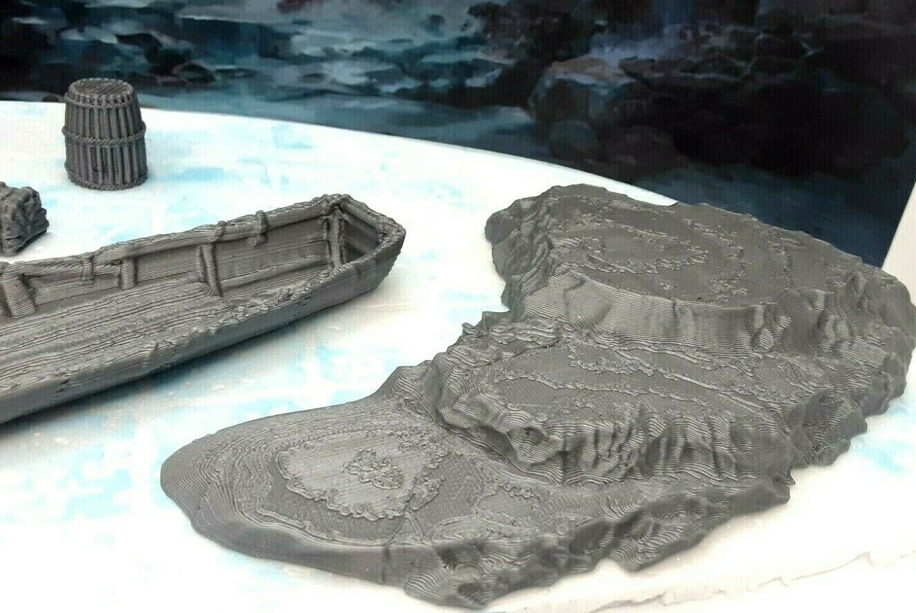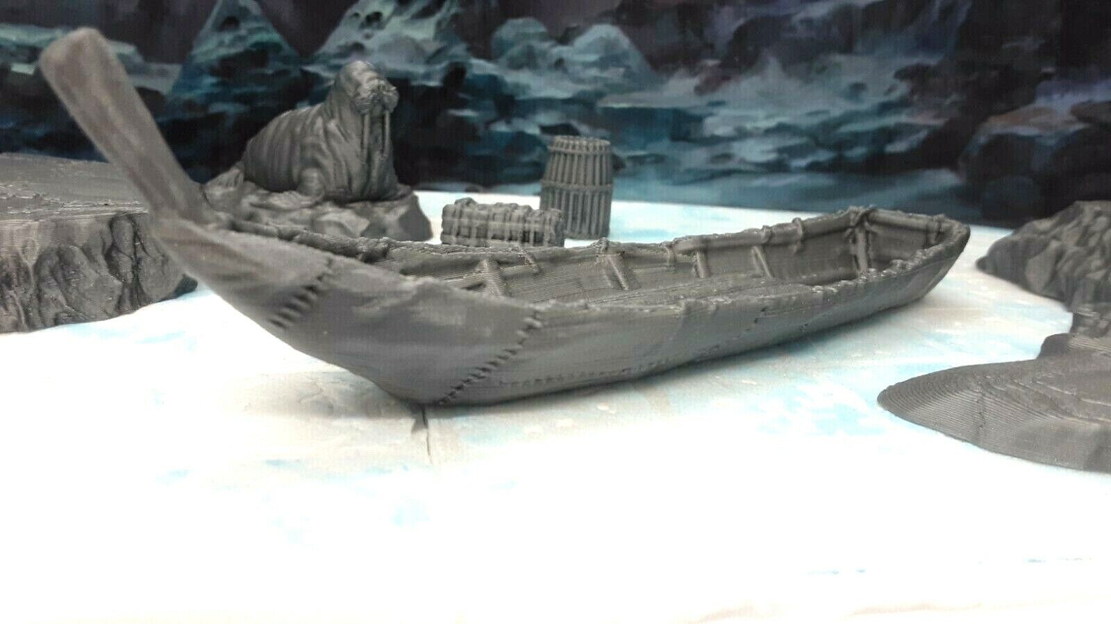 The boat measures approximately 5" long and 1" wide. The ice shelves measure approximately 5.5" long and 3.5" wide. They are placed beside a D20 die (NOT included in sale) for size reference. This is sized to work with most 25mm/28mm/32mm scale or similar miniatures from many popular RPG dice games such as Dungeons and Dragons, Pathfinder, Warhammer, and many others.