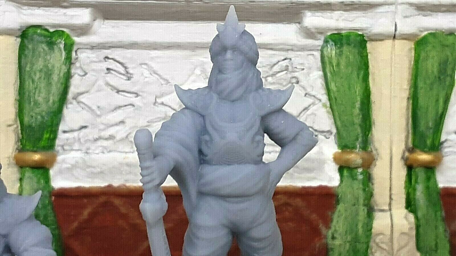 This unpainted 3D printed set comes in easy to paint gray resin. The standing figure stands approximately 1.75" tall. They are on a 1" base. They are placed on a 1" x 1" grid surface in the photo for size reference. These pieces are sized to work with all 28mm/32mm scale or similar miniatures from many popular RPG dice games such as Dungeons and Dragons, Pathfinder, Warhammer, and many others.