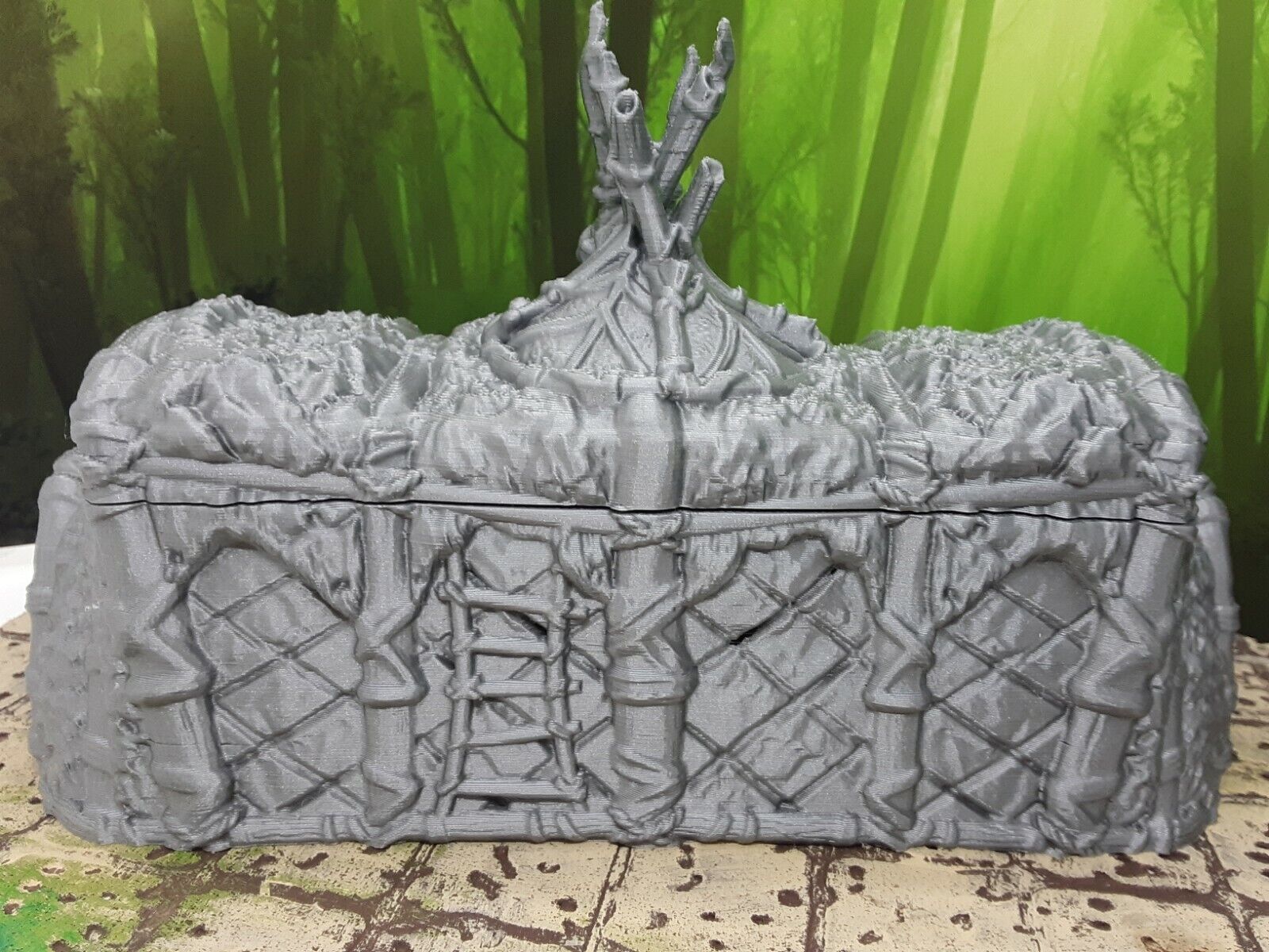 This unpainted 3D printed model set comes in silver, easy to paint, PLA plastic. It measures approximately 4.75" tall, 3.5" wide, and 6.75" long. It is placed on a 1" x 1" grid surface in the photo, and beside a D20 die (NOT included in sale) for size reference. This is sized to work with most 28mm/32mm scale or similar miniatures from many popular RPG dice games such as Dungeons and Dragons, Pathfinder, Warhammer, and many others.