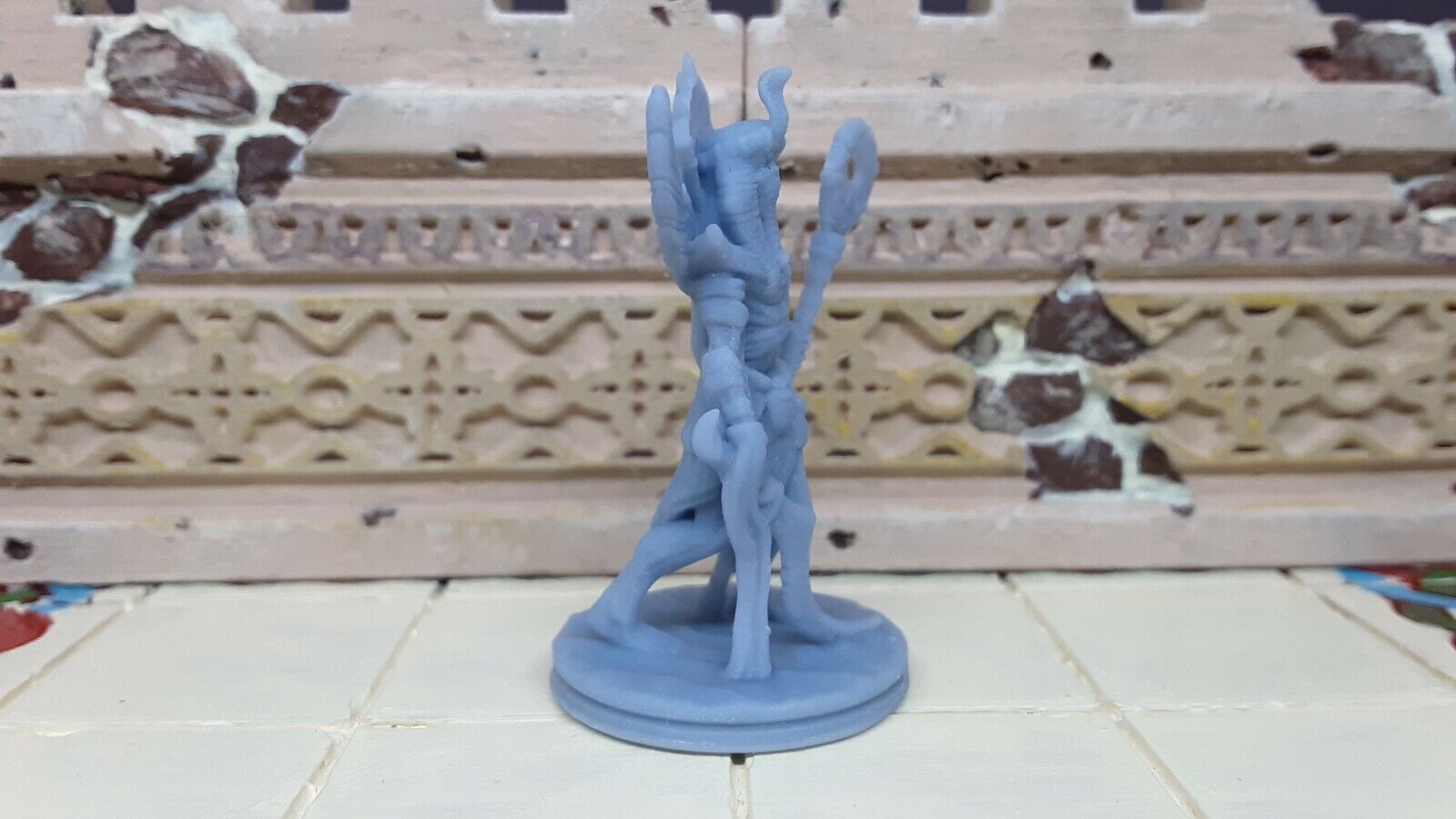 This unpainted 3D printed piece comes in easy to paint gray resin. The figure stands approximately 1.75" tall at it's highest point. It is placed on a 1" x 1" grid surface in the photo for size reference. It is sized to work with all 28mm/32mm scale or similar miniatures from many popular RPG dice games such as Dungeons and Dragons, Pathfinder, Warhammer, and many others.