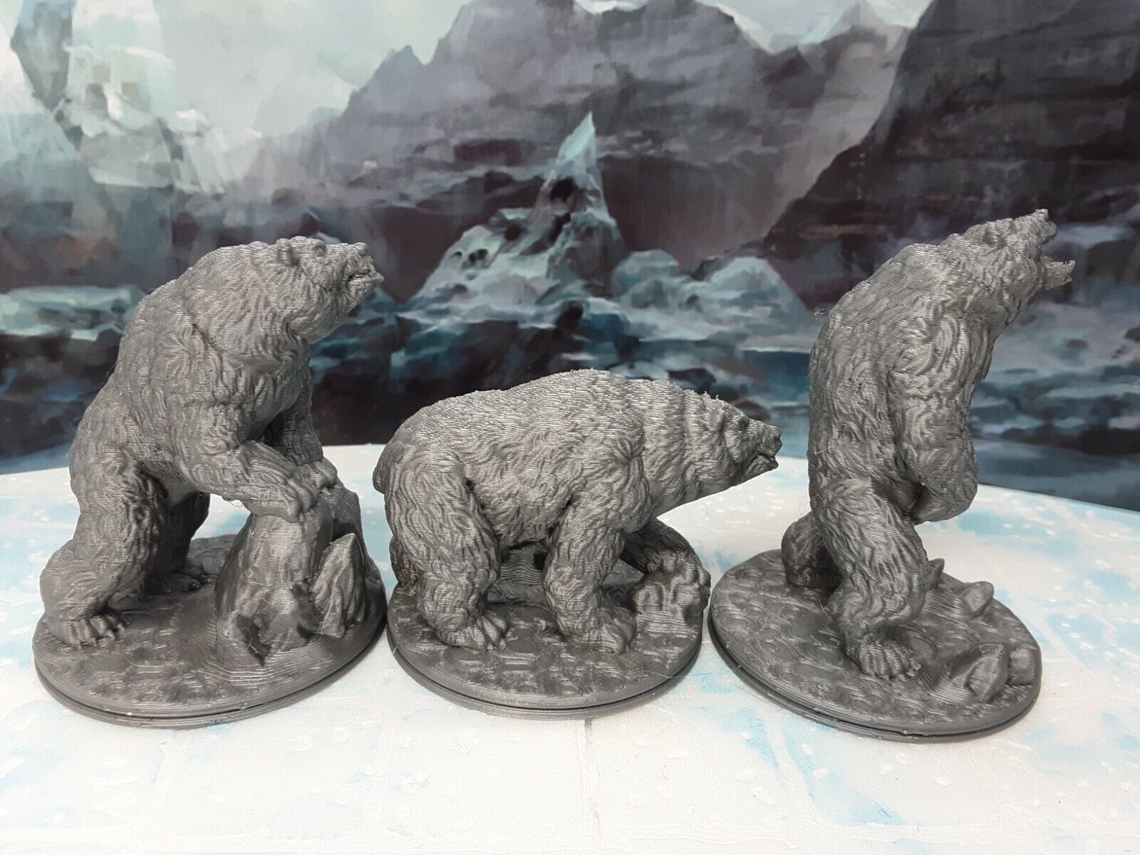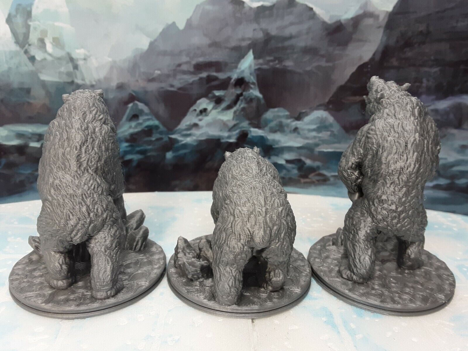 This unpainted 3D printed model set comes in silver, easy to paint, PLA plastic. The standing bear measures approximately 2.75" tall. The bases measure 2" in diameter. They are placed on a 1" x 1" grid surface in the photo, and beside a D20 die (NOT included in sale) for size reference. This piece is sized to work with all 28mm/32mm scale or similar miniatures from many popular RPG dice games such as Dungeons and Dragons, Pathfinder, Warhammer, and many others.