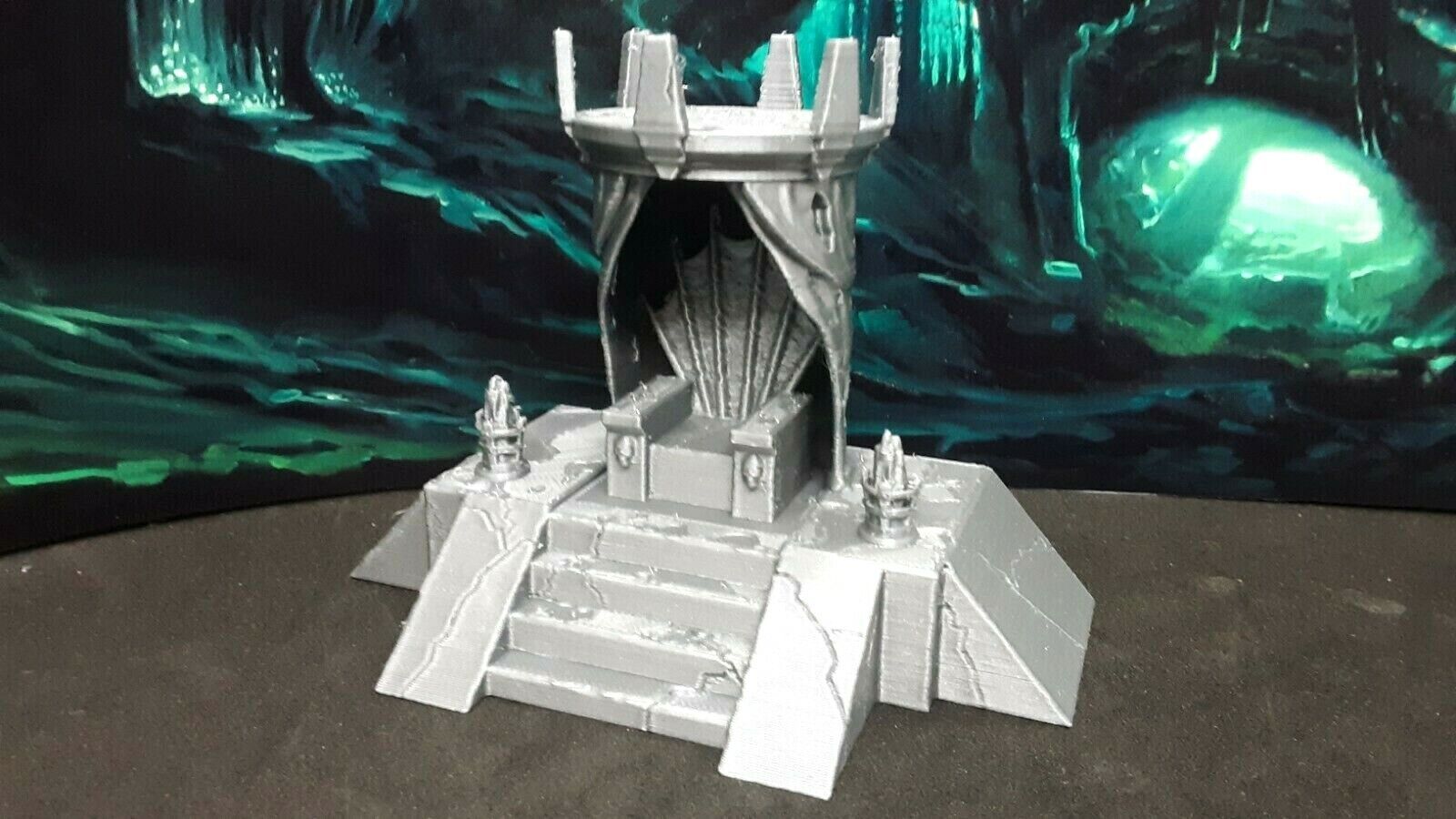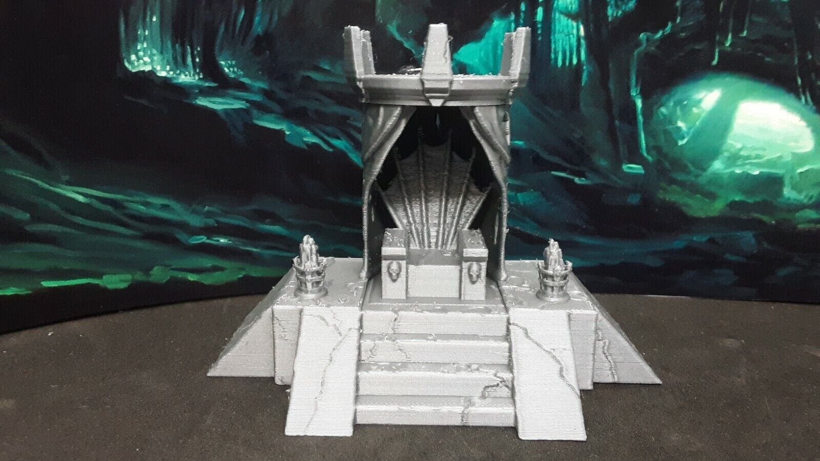 This Lich's Throne is designed by EC3D/Hero's Hoard and licensed to us to manufacture via 3D printer. The 3D printed piece is made of easily paintable, silver PLA plastic. The piece is 28mm scale, and measures approximately 4.5" x "2.5 x "4. It is sized to work with all 28mm and 32mm scale miniatures from many popular RPG dice games such as Dungeons and Dragons, Pathfinder, Warhammer, and many others.