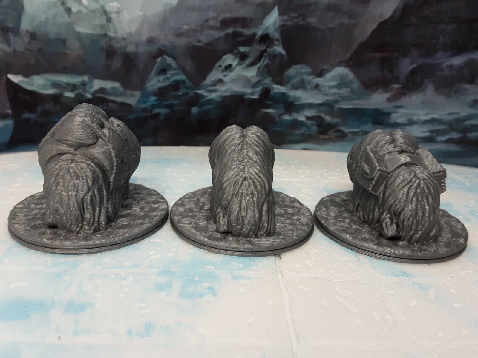 This unpainted 3D printed model set comes in silver, easy to paint, PLA plastic. Each yak measures approximately 1.25" tall. The bases measure 2" in diameter. They are placed on a 1" x 1" grid surface in the photo, and beside a D20 die (NOT included in sale) for size reference. This pieces are sized to work with all 28mm/32mm scale or similar miniatures from many popular RPG dice games such as Dungeons and Dragons, Pathfinder, Warhammer, and many others.