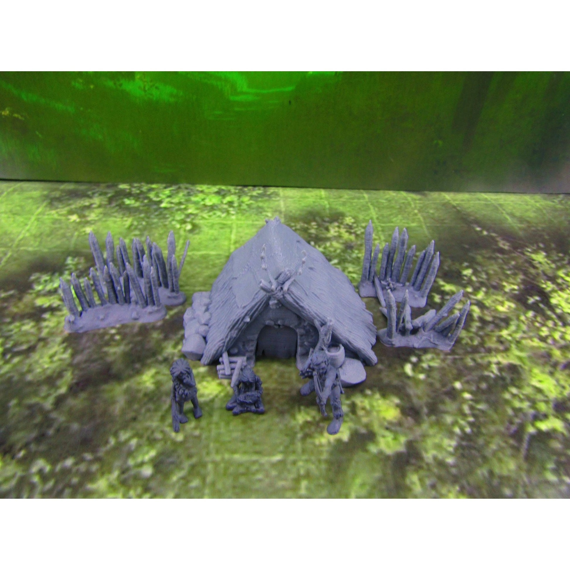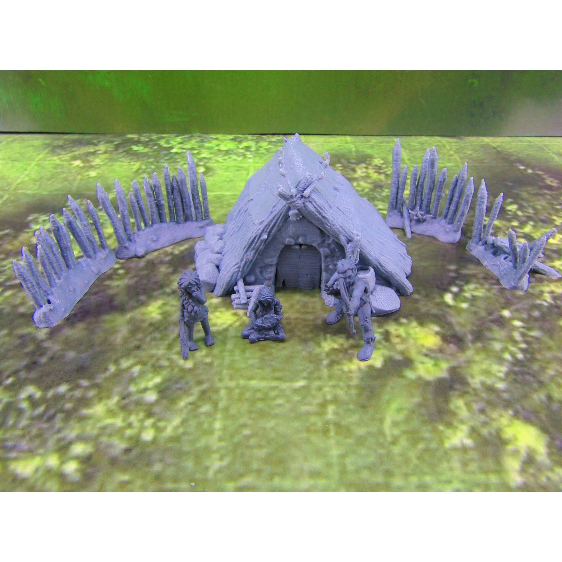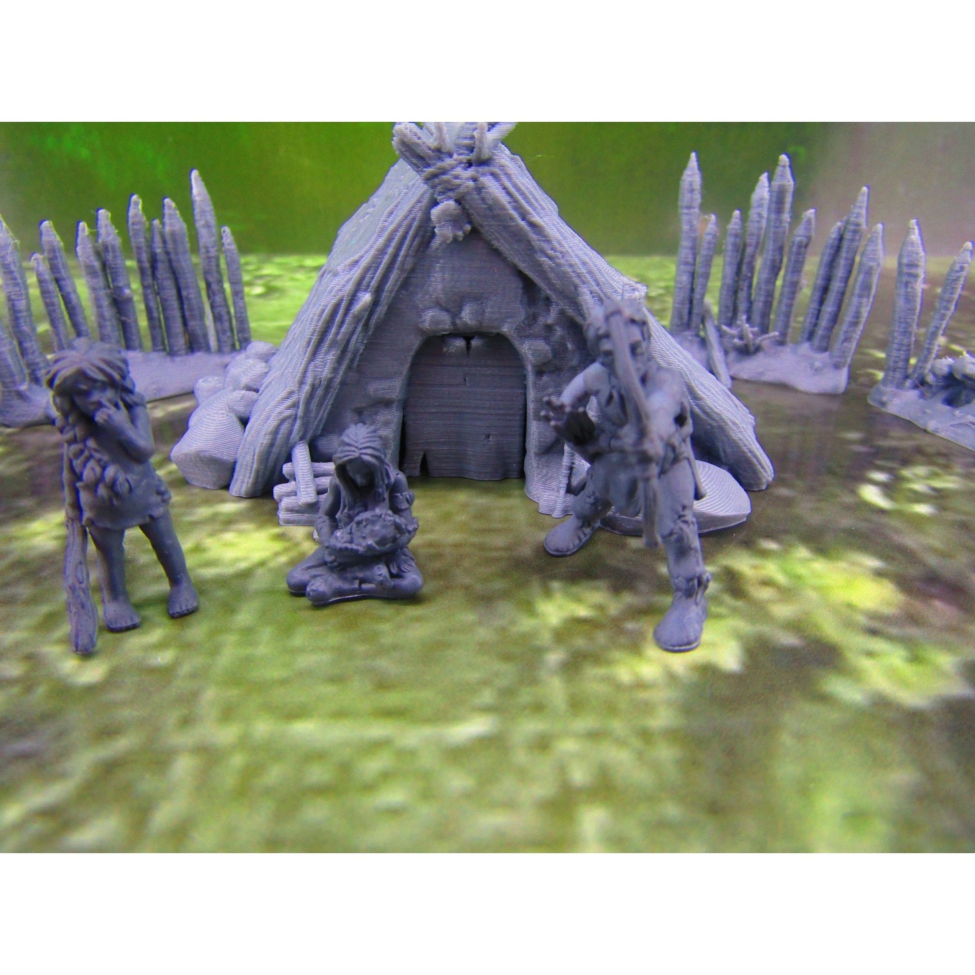 Prehistoric Hut & Fence Sections W/ 3pc Caveman Family Set Scatter Terrain Scenery Mini Miniature Model 28mm/32mm Scale RPG Tabletop Gaming