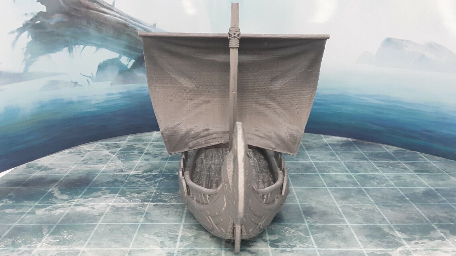 This unpainted 3D printed model comes in silver, easy to paint, PLA plastic. The sail requires some assembly. Hobby or super glue works great (sanding is recommended). The sail then easily slides in and out the boat to enable to be used with or without the sail. The ship measures approximately 5.5" tall and 8.5" long. It is placed beside a D20 die (NOT included in sale) for size reference. This is sized to work with most 28mm/32mm scale or similar miniatures from many popular RPG dice games such as Dungeons and Dragons, Pathfinder, Warhammer, and many others.