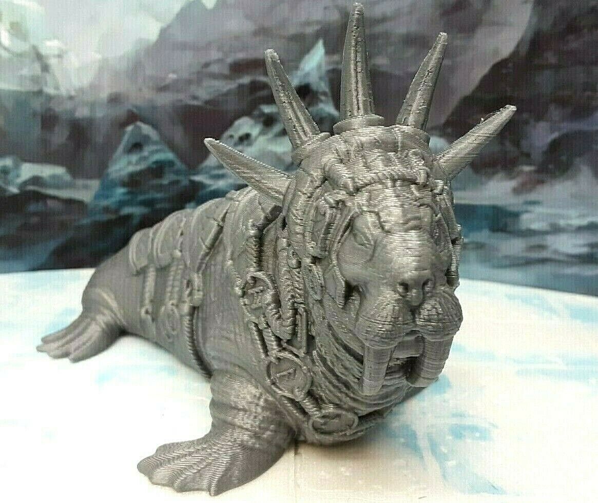 This unpainted 3D printed model comes in silver, easy to paint, PLA plastic. The walrus god measures approximately 3.5" tall and is approximately 5" long. The piece are placed on a 1" x 1" grid surface in the photo for size reference. This piece is sized to work with all 28mm/32mm scale or similar miniatures from many popular RPG dice games such as Dungeons and Dragons, Pathfinder, Warhammer, and many others.